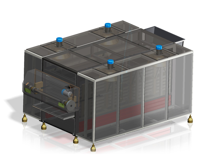 또 다른 특징으로는 메쉬를 이용하여 제품을 흔들면서 열원이 골고루 전달되게 하여 일정한 수분유지를 통해 제품의 품질을 균일하게 만드는 기능을 하는데 획기적인 건조기입니다. 이 모델은 포장과 운송비 절감을 위하여 본체를 3piece 분리 조립형으로 제작하였습니다. Main Body와 Side Body가 서로 조립과 분리가 쉽도록 설계되었습니다.
